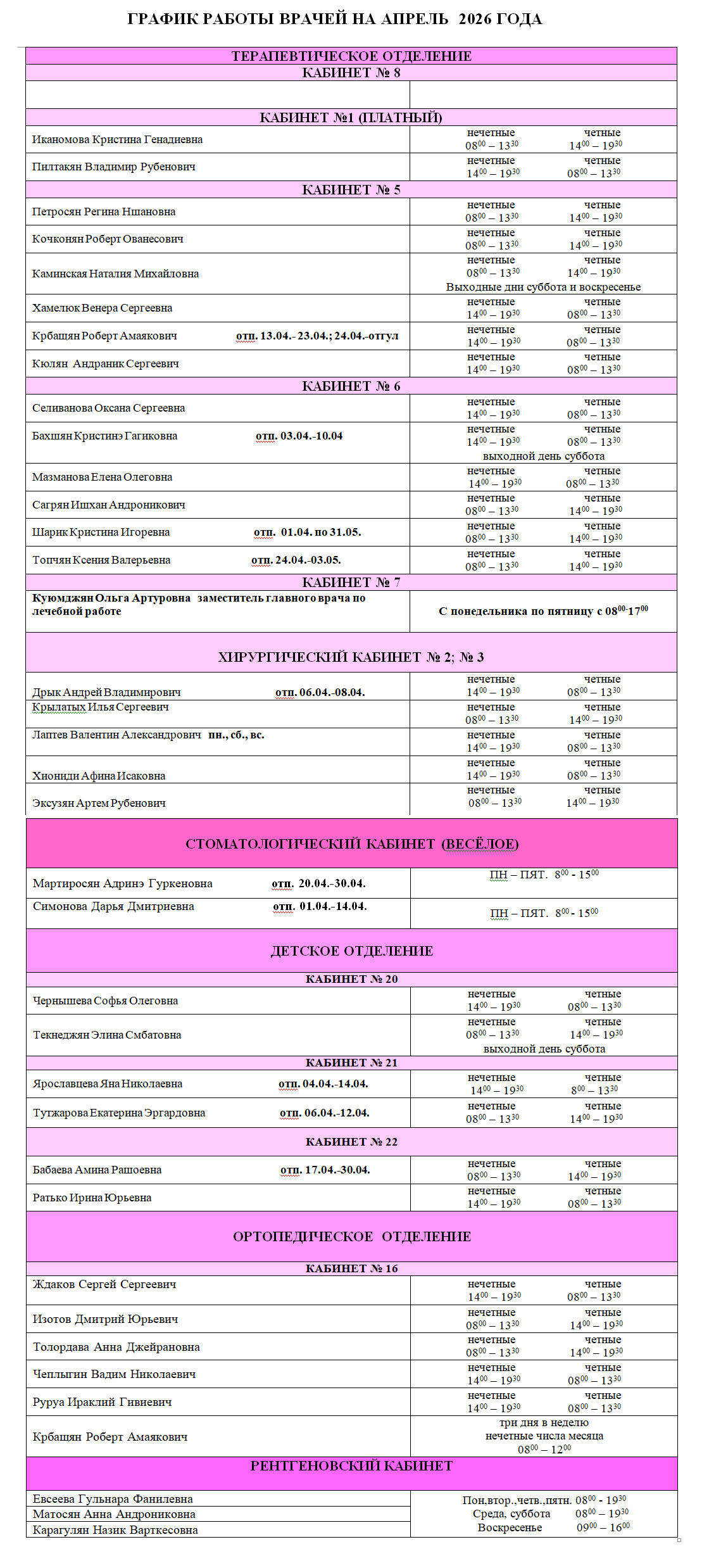 График работы и часы приема медицинских работников: с 8:00 до 13:30 и с 14:00 до 19:30